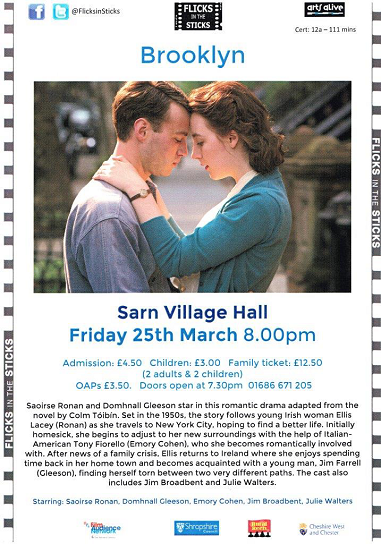 So, on Friday, March 25th, we will be showing ‘BROOKLYN’ in Sarn Village Hall. As usual, we will have a licenced bar also offering tea, coffee and soft cold drinks; there will be a short refreshments interval roughly half way through the film.