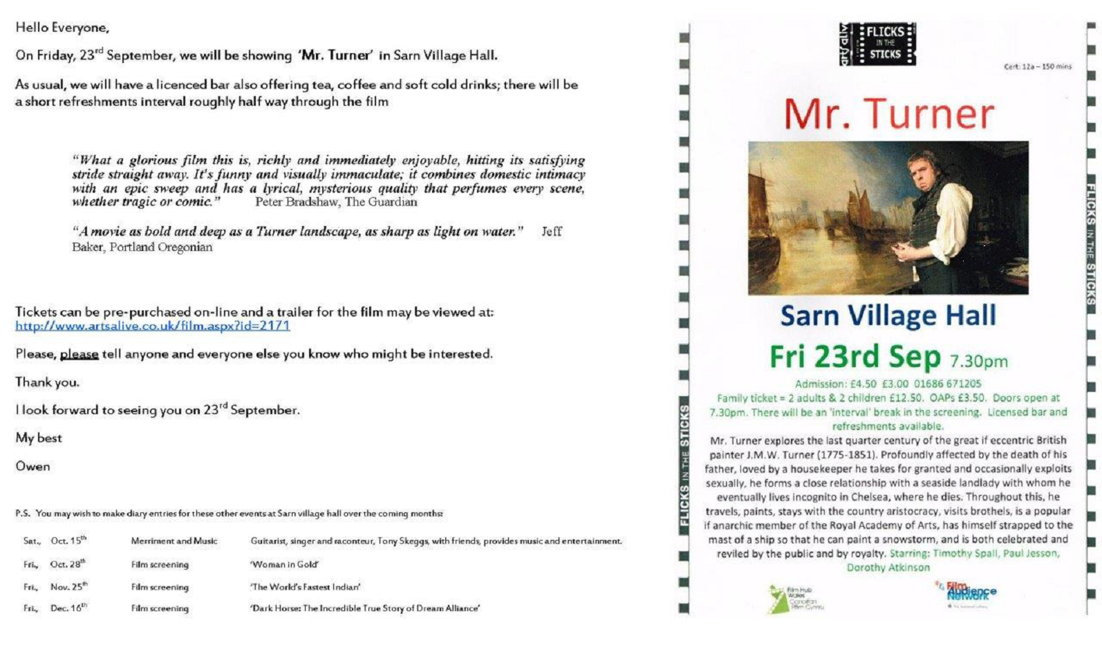 Film screening, Sarn village hall, Friday 23rd September. See: http://www.artsalive.co.uk/film.aspx?id=2171 Share this: Share on X (Opens in new window) X Share on Facebook (Opens in new window) Facebook Like Loading... Related Published by owenandbarb View all posts by owenandbarb