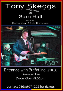 Sarn Hall. Saturday 15th October. An evening with TONY SKEGGS and friends. Share this: Share on X (Opens in new window) X Share on Facebook (Opens in new window) Facebook Like Loading... Related Published by owenandbarb View all posts by owenandbarb