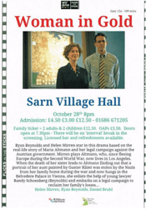 Last reminder, everyone. We are screening ‘Woman in Gold’ at Sarn village hall tomorrow evening. Doors open 7.30pm. Hope to see you there.
