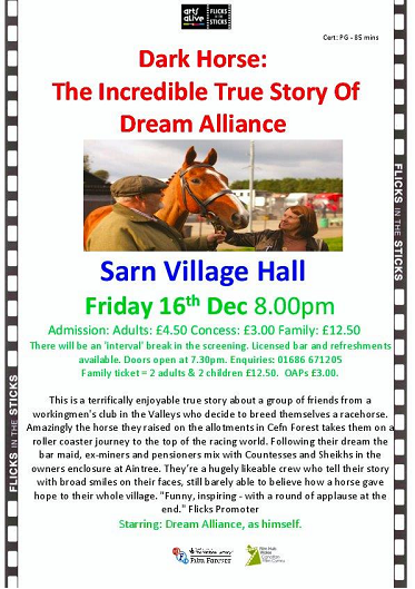 On Friday, December 16th , we will be showing ‘Dark Horse: The Incredible True Story Of Dream Alliance’ in Sarn Community Centre.
