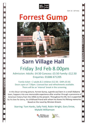 On Friday, February 3rd , we will be showing the Academy Award winning ‘Forest Gump’ in Sarn’s community hall.