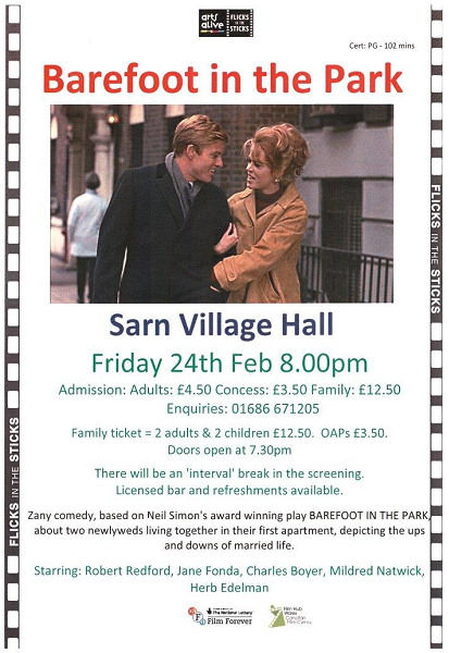 On Friday, February 24th , we will be showing ‘Barefoot in the Park’ in Sarn’s community hall.