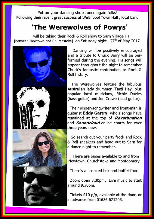 Eddy Gartry and the Werewolves of Powys. Saturday, 27th May, 2017. Sarn village hall. Share this: Share on X (Opens in new window) X Share on Facebook (Opens in new window) Facebook Like Loading... Related Published by owenandbarb View all posts by owenandbarb