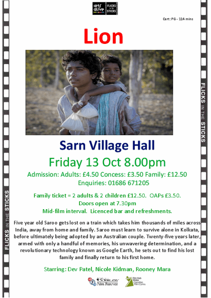 On Friday 13th October we will be showing ‘Lion’ in Sarn village hall.