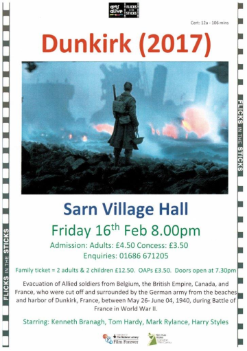 On Friday, 16th February, we will be showing ‘Dunkirk (2017)’ in Sarn village hall.