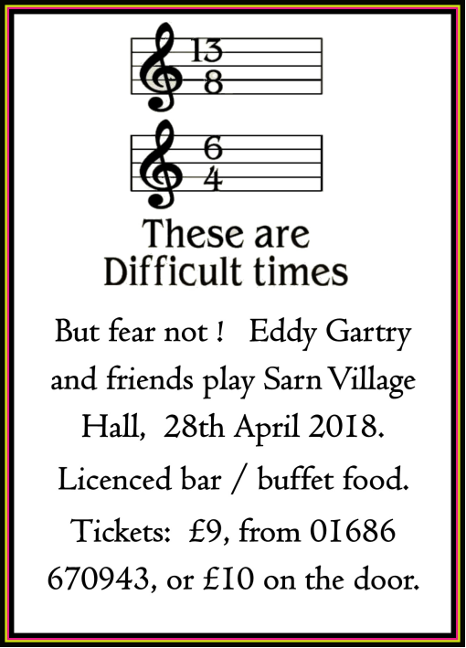 Saturday, 28th April, Sarn village hall. EDDY GARTRY & THE WEREWOLVES OF POWYS