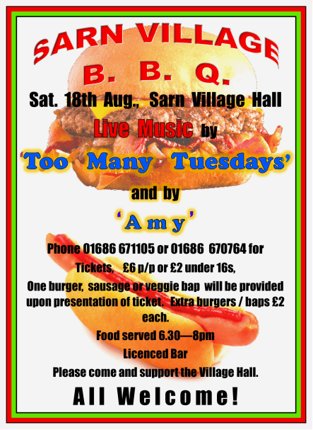 Barbeque at Sarn village hall, Saturday 18th August Share this: Share on X (Opens in new window) X Share on Facebook (Opens in new window) Facebook Like Loading... Related Published by owenandbarb View all posts by owenandbarb