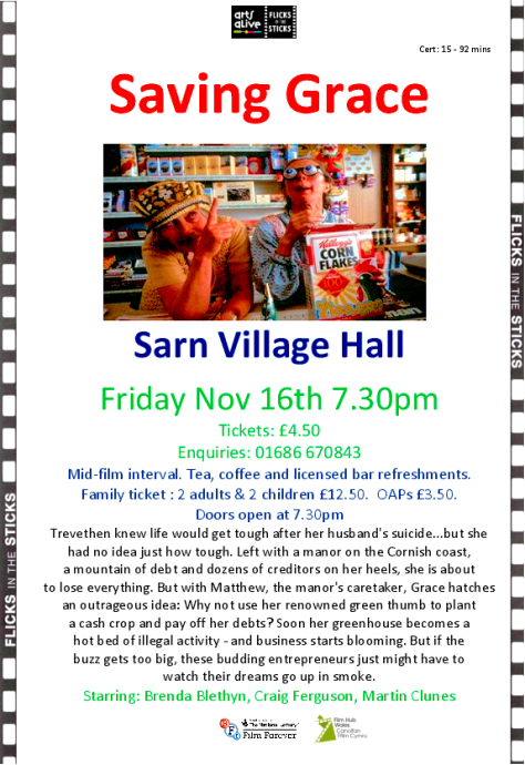 ‘Flicks In The Sticks’ screening, Sarn Village Hall, Friday, 16th November 2018 Just a last reminder. Regards Owen Share this: Share on X (Opens in new window) X Share on Facebook (Opens in new window) Facebook Like Loading... Related Published by owenandbarb View all posts by owenandbarb