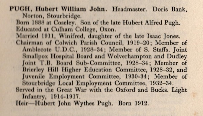 HUBERT WILLIAM JOHN PUGH Extract from ‘Who’s Who In Staffordshire’, published by Ebenezer Bayliss & Son Ltd., 1934 Share this: Share on X (Opens in new window) X Share on Facebook (Opens in new window) Facebook Like Loading... Related Published by owenandbarb View all posts by owenandbarb